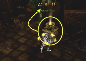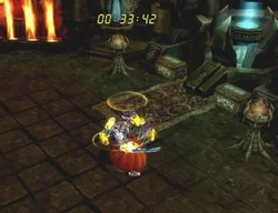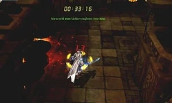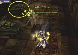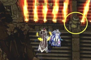 This long hallway has fire cannons that will shoot at you while you run by. With a defense of 800-900, they will hit you for about 200-300. If you need to, you might want to turn on BM and/or aura to run by. Once you get to the end of the hallway, you will need to break a wall of fire down to go into the next room (while being shot at by the cannons)